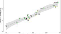 Vitamin C content of the stem and root was measured by the Folin-Dennis colorimetric method47. The sample extract (1.5 ml) was reacted with the test reagent to produce a blue color product and its absorbance was measured spectrophotometrically at 760 nm. In the same procedure, the absorbance was measured using different known concentrations of ascorbic acid to generate a standard curve. By plotting the absorbance value of the sample in the linear equation (y = 48.754x + 0.1928, R2 = 0.9967) of the standard curve, the content of vitamin C was measured and expressed as mg/gm FW.