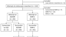 ESMR-L was conducted using a ligation device (Sumitomo Bakelite Co., Ltd., Tokyo, Japan) attached to the endoscope. After injecting 10% glycerin solution mixed with a small amount of indigo carmine into the submucosal layer, the lifted lesion was suctioned into the ligation device, and an elastic band was deployed10. The lesion was resected by snaring under the band. In the EMR-C procedure, the same solution used in ESMR-L was injected into the submucosal layer and a transparent cap for EMR-C was fitted to the scope. After a crescent-type snare was looped along the cap’s inner lip, the lesion was sequentially suctioned into the cap, grasped using the snare, and resected11. For the ESD procedure, 10% glycerin solution and/or 0.4% hyaluronic acid (MucoUp; Johnson & Johnson, Tokyo, Japan) were mixed with a small amount of indigo carmine and injected into the submucosal layer around the lesion. A Dual knife (Olympus) or an SB Knife Jr (Sumitomo Bakelite Co., Ltd.) was used for mucosal incision and submucosal resection. Hemostatic forceps were used to stop and prevent bleeding during the procedure.
