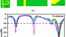 Literature is full of mmWave antenna designs, but it has been noticed that the 8-port MIMO antenna for mmWave (5G NR n260) with good performance is rarely reported. The annular ring is very popular in planar antenna design due to its compact size, ability to support multiple modes, and capability to reduce back radiation29,30. Four antenna designs (Designs 1–4) in 32–42 GHz range are shown in Fig. 1a, plotting the reflection coefficient against frequency. An appropriate geometric configuration is chosen for each design. Design-1 is a circular patch antenna, and the radius of the circular patch in terms of resonating frequency (\(f_0\)) is computed by Eq. 1 as reported in31, using the substrate (RT/Duorid (5870 tm): \(\varepsilon _r=2.33\), \(h=0.508\) mm) and design frequency of 36 GHz \(\in\) (5G NR n260). Due to power losses, Design-1 exhibits a narrow band and poor reflection coefficients in the 5G NR n260 band. In Design-2, an annular ring radiator is introduced for further improvement. The physical dimensions (\(r_1=\) inner circle radius and \(r_2=\) outer circle radius) of the annular ring are calculated in Eqs. ( 2– 4) based on the work reported in31: