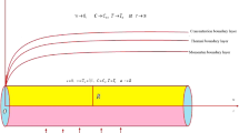 This study examines the flow of a nanofluid that contains MWCNT and SWCNT immersed as nanoparticles in propylene glycol (\({\text{C}}_{3}{\text{H}}_{8}{\text{O}}_{2}\)). In order to investigate the flow properties, a stretched cylinder with porous walls is considered. Various factors, including DF, thermal radiation, and intermolecular friction force, are taken into account. Moreover, a chemical process involving Arrhenius kinetics takes place at the cylinder’s surface. The cylinder is stretched along the x-direction with a velocity of \(u_{1w} = \frac{{u_{{1_{0} }} x}}{l}\). \({T}_{w}\) and \({T}_{\infty }\) represent the surface and ambient temperatures of the fluid, respectively. The flow is influenced by a uniform magnetic field oriented perpendicularly. Figure 1 is a representation of the flow diagram in its schematic form. The mathematical model governing the steady flow across a stretched cylinder with porous walls, considering Darcy–Forchheimer effects and thermal radiation under the boundary layer approximation is expressed as follows51,52: