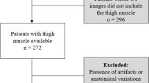 Single cross-sectional images at the third lumbar vertebra (L3) were examined using Slice-O-Matic software (v5.0, Tomovision®, Montreal, Canada). All contrast-enhanced CT scans were analyzed. Tissues were delineated using specific Hounsfield Units (HU) thresholds: -29 to + 150 for skeletal muscle, -150 to -50 for visceral adipose tissue (VAT), and − 190 to -30 for subcutaneous (SAT) and intermuscular adipose tissue (IMAT)28. Subsequently, cross-sectional areas (cm2) of these tissues were computed for each image. SM values (cm2) were normalized by dividing total muscle cross-sectional area by height2 (SMI in cm2/m2). Skeletal muscle radiodensity (SMD) was obtained by averaging the HU of SM from cross-sectional images.