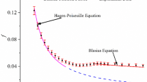 According to previous research33, for millimeter-scale circular pipes, the friction factor adheres to the Blasius equation34 when the Reynolds number exceeds 3000, marking the onset of the turbulent regime. Figure 2 illustrates the correlation between the friction factor of clean water and the Reynolds number. The friction factor of water aligns well with the Blasius equation, exhibiting errors within ± 5%. Furthermore, the friction factor of water also corresponds to the prediction of the Drew correlation35 for Newtonian fluids in turbulent flow within a smooth pipe. This confirms the strong consistency between the experimental data and theoretical predictions, thereby validating the reliability of the experimental results.