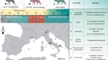 We molecularly analyzed 113 presumed wolf biological samples (Table 1 and Table S1), opportunistically collected from individuals found dead or injured across the central-southern Apennine range of the species (Fig. 1), selected from the ISPRA Canis biobank33. Biological materials included 57 samples (24 females, 32 males and 1 not sex determined) collected from 1993 to 2000 (roughly corresponding to about two wolf generations), namely during the beginning of the population re-expansion phase, occurred after the last population bottleneck22, (hereafter referred to as historical wolf samples, HW). Additionally, biological materials included 56 samples (28 females and 28 males) collected from 2020 to 2024 (corresponding to a single actual wolf generation), namely the period when the species has presumably saturated all the ecologically suitable mountain and rural areas27 (hereafter referred to as contemporary wolf samples, CW). For 47 HW and 49 CW, a fragment of about 1 cm3 of muscular tissue was cut and stored in 50 ml of ethanol 95% at − 20 °C, for 1 HW and 7 CW, 1 ml of fresh blood was collected and preserved in EDTA solution at − 20 °C. For 7 HW samples, the entire petrous bone was collected and stored at 4 °C. For 2 HW individuals, DNA samples were independently derived from both tissue and petrous bone sources to check for the real quality of skeletal DNA and its applicability in genotyping procedures (Table 1 and Table S1).
