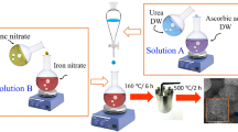 To synthesize ZF-doped porous microspheres, ascorbic acid (3.17 g) and urea (1.3 g) were combined with 20 cc ionized water and added dropwise to an aqueous solution of Fe(NO3)2.9H2O and Zn(NO3)2.6H2O with 0, 15 and 20 wt% Co(NO3)2.6H2O. After 0.5 h of magnetic stirring, the solution was heated in a 50 cc stainless steel autoclave for 6 h at 160 °C. The obtained precipitate was dried after washing with deionized water and ethanol at 60 °C. Then, they annealed at 500 °C. The samples were designated ZC0, ZC15, and ZC20, respectively, according to the cobalt percentage. In Fig. S1 (a) the steps of sample synthesis are schematically shown.