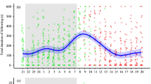 Next, to examine temporal changes in behaviour over 24 h, a 10-min video clip was extracted from 10 to 30 min of each hour. Twenty-four video clips were collected for analysis for each male-female pair. Medaka spawning behaviour proceeds in a sequence of events12,32,45,46: the male pursues the female (following), the male swims rapidly around the female (quick circle), the male encircles the female with its dorsal and anal fins (wrapping), the female releases eggs, the male releases sperm (egg and sperm release), and the male separates from the female (leaving). After spawning, the female carried the eggs attached to her abdomen for several hours, rubbing her abdomen against the aquatic plants and depositing the eggs onto the plants. Based on previous studies12,31,45,46, two courtship behaviours were quantified within the 10-minute video clips: duration of following (where the male followed the female) and frequency of quick circles (where the male circled in front of the female).