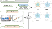 Where predictors and predictands sets are represented by \(\:{\text{x}}_{\text{i}}\) and \(\:{\text{y}}_{\text{i}}\) respectively and \(\:\text{i}\) is any value assumed from 1 up to any number \(\:\text{n}\) which is the overall number of the datapoints. The predictions are illustrated by the symbol \(\:{\upgamma\:}\) as shown in the equation of loss function. Different loss functions can be considered including mean squared error (MSE). Different hyperparameters including maximum depth of trees for base learners, number of trees, and learning rate of boosting either using default or assumed parameters or using GridsearchCV which is a library for automatic searching of best parameters for a dataset in python62.