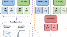Clinical parameters were received in form of an incomplete matrix (datasets with missing measurements) and considered for separate analysis: age at onset and disease duration (analyzed as full years, Supplementary Table 1, Table 1), weight (total n = 174 complete records, Cohorts 2 & 3), height and body mass index (BMI, total n = 173 complete records, Cohorts 2 & 3), Montreal Cognitive Assessment Index Score137 (MoCA, total n = 240, Cohorts 1, 2, & 3), MDS-Unified Parkinson’s Disease Rating Scale33 section III (UPDRS-III, total n = 221, non-MDS ratings138 (n = 14) were not used, Cohorts 1, 2, & 3), Beck Depression Inventory–II139 (BDI-II, total n = 172, Cohorts 1, 2, & 3), L-Dopa equivalent daily dose (LEDD, total n = 259, Cohorts 1, 2, & 3), CSF-measured neurofilament light chain protein level (Nfl, total n = 111, Cohorts 1, 2, & 3), plasma-measured Nfl (total n = 38, Cohort 2), CSF-measured α-synuclein (total n = 77, Cohorts 1 & 3), CSF-measured Aβ38 (total n = 35, Cohort 2), CSF-measured Aβ40 (total n = 36, Cohorts 2 & 3), CSF-measured Aβ42 and human total tau (total n = 151, Cohorts 1, 2, & 3), p-tau-181 (total n = 150, Cohorts 1, 2, & 3). In other words, with each parameter measured for a certain n number of individuals’ samples statistical analysis was measured based on the finalized table with the n number of parameter entries and measured NMR data.
