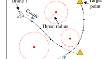 where the angular rate and velocity are indicated appropriately, \(ri\) denotes the linear component, and \(vi > 0\) indicates the heading angle. \(0 < vi \sim vmax\) and \(rmin\) \(ri \sim rmax\) are the UAV states in which vmax represents the maximum velocity and where \(rmin\) and \(rmax\) are the lower and upper bounds of the angular rate, respectively. For input, there is an angular rate \(ri\) and a bounded and measurable velocity \(vi\)24. Equation (4)25,26 expresses the kinematics of the moving target, \(p_{i} = \left[ {\begin{array}{*{20}c} {x_{i} } \\ {y_{i} } \\ \end{array} } \right]\).