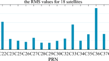 Equations 2 and 3 demonstrate the application of these corrections. In Eq. 2, \({\mathbf{X}}_{{{\text{orbit}}}}\) represents the computed real-time precise satellite position, obtained by applying the correction vector \(\delta {\mathbf{X}}\) to the broadcast ephemeris position \({\mathbf{X}}_{{{\text{broadcast}}}}\). Similarly, Eq. 3 expresses \(t_{{{\text{satellite}}}}\), the precise clock offset, as the broadcast ephemeris clock offset \(t_{{{\text{broadcast}}}}\) adjusted by the term \(\frac{{C_{0} }}{c}\), where \(C_{0}\) is the clock correction parameter received through the PPP-B2b service, and \(c\) represents the speed of light in vacuum.