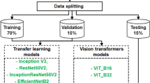 Khedr et al.24 performed comparative study of ViT_B32 and ViT_B16 on a bladder cancer dataset. The ViT_B32 and ViT_B16 achieved an accuracy of 99.23% and 99.49% respectively. Using histopathological images, the Shalata et al.25 designed a multi-scale pyramidal CNN to grade Non-Muscle Invasive Bladder Cancer (NMIBC) accurately. Histopathological images containing various grades of cancer severities were obtained from NMIBC tissue samples. Their model achieved 94.29% F1-score, 94.47% sensitivity, 94.03% specificity, and 94.25% accuracy on test data. Recent studies26 reported that artificial intelligence can improve speed and accuracy of diagnosis. They developed an algorithm and trained on 925 images. Their model achieved a sensitivity of 72% for muscularis propria and 65% for tumors. Yang et al.27 performed a comparative study using LeNet, AlexNet and GoogLeNet on the cystoscopic images and obtained the highest accuracy of 96.9%. In another research, using two machine-learning algorithms, a label-free technique is used to detect bladder cancer cells in urine samples. Their method reported that cells were classified with 99% accuracy and 97% AUC for cell lines. The gradient boosting algorithm obtained 95% accuracy and 93% AUC for urine samples, whereas the deep-learning algorithm obtained 96% accuracy and 96% AUC28. To aid the preoperative diagnosis of both MIBC and NMIBC, the research29 proposes a combination models strategy using multi-parametric MRI. The approach outperformed urologists and matched senior radiologists, achieving an accuracy of 0.869 and an AUC of 0.928 in the internal cohort after being tested on 436 patients using five-fold cross-validation. These results suggest that CMS helps junior clinicians diagnose MIBC before surgery. Jiang et al.30 presents a urine-based DNA methylation diagnostic panel for detecting bladder cancer (BC). Their method uses the decision tree algorithm and obtained a specificity of 90.9%.