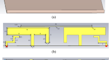 The illustrated configuration of the basic coupler is shown in Fig. 4, demonstrating the utilization of four T-shaped branches that replaced the conventional BLC structure. Table 1 presents the calculated parameters for the dual-band BLC implemented with the T-section transmission lines, obtained through (4–16), where both sections have electrical lengths of (\(\theta _a=30^\circ\),\(\theta _b=60^\circ\)). These dimensions are adjusted through EM simulation, demonstrating mutual validation between the simulation and analysis results. Moreover, Fig. 5 illustrates the schematic of the dual-band BLC, designed to operate at frequencies of 0.7 GHz and 3.5 GHz, simulated using CST Microwave Studio.