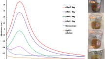 Figure 1a show the color change of the precursor solution containing only sodium hydroxide and silver nitrate, from a transparent to a dark brown color tone by the separate addition of PVP and rosemary (Rosmarinus officinalis L.) extract at different times corresponding to 1 and 3 h. On the other hand, Fig. 1b,c display color change when both, PVP as a stabilizing agent and rosemary extract as reducing agent were added in a single synthesis reaction for 3 h as described in methos. Dark color reached after 3 h single step synthesis indicated complete reduction and so, successful nanocomposite synthesis.