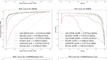 Two human LDA datasets, Dataset 1 and Dataset 22,42, were used to evaluate the model and achieve predictions. lncRNAs, diseases, and experimentally confirmed LDAs in the two datasets were obtained from the lncRNADisease v2.046 and MNDR v2.047 databases, respectively. We removed diseases which have no MESH information or regular name, and lncRNAs which are lack of sequence data. After preprocessing, Dataset 1 includes 92 lncRNAs, 157 diseases, and 605 LDAs. Dataset 2 includes 89 lncRNAs, 190 diseases, and 1,529 LDAs. The preprocessed datasets are illustrated in Table 1. The association network was represented as a matrix \(\varvec{Y} \in {\Re ^{n \times m}}\) where \(y_{i j}\) is 1 when there is an association between the i-th lncRNA and the j-th disease, \(y_{i j}\) is 0 otherwise.