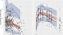 Following visual inspection of the prespecified covariates, their effects on PK parameters were assessed using ECMO. The basic GOF plots (Fig. 4a, b) revealed that the final model was acceptable because the predicted population and individual concentrations closely aligned with the observed concentrations. Additionally, most conditional weighted residual values were evenly distributed randomly around the line of unity (± 2 standard deviations of the mean), which indicated the suitability of the error model (Fig. 4c, d). A visual predictive check plot based on n = 500 simulations with the final model is shown in Fig. 5. The proportion of observations between the 5th and 95th simulated percentiles was > 90%, which was deemed acceptable.