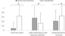 To commence the trial, the female pair was brought to the gate being lured by meat (Fig. 1). For the neutral test, the resource (meat) was placed on a stick against the fence at an equal distance between the two females, giving them equal opportunity to approach and possess the “resource.” The meat block was placed on the stick to make it difficult to pull off and consume (possess), therefore giving each lion time to supplant the first individual that tried to take “ownership” by biting the meat with approximately 30 s between each round to allow for a reset. For each treatment for each pair, meat was presented a total of 10 times occurring on two separate days (except in rare cases when one female was reluctant to return, usually after receiving excessive aggression, then only repeated 6 times as a humane endpoint). A lioness was considered “dominant” if she monopolized (consumed) the resource at least 70% of the time [note: in all but one pair the ratio was 90–100%]. Neutral tests were directly followed by the non-neutral tests in which an additional set of 5 rounds of meat presentation was administered per treatment day (total of 10 rounds). In non-neutral tests, the meat was held closer to the subordinate, as determined by the neutral test, giving the subordinate a chance to reach the meat first and claim “ownership.” It was then observed whether the dominant female allowed the subordinate to maintain possession, or if she overtook the resource regardless of the “ownership” rule normally observed in female lions in the wild.