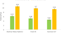 Among interactions, growing maize under irrigated condition with the application of nitrogen at SI of 96–100% (9508.2 kg ha− 1) recorded significantly higher grain and straw yield as compared to the rest of the treatments (Fig. 6c). Higher application of nitrogen under SPAD based nitrogen application treatments, which synchronized with the crop demand at V3, V5 and V8 stage led to the greater uptake, improved photosynthesis and proper partitioning of the photosynthates to sink resulted in higher dry matter production. Post-anthesis application of nitrogen (at V12/VT and R1 stage) have led to the maintenance of higher green leaf area per plant and translocation of assimilates towards reproductive parts resulted in higher yield attributes47. Maximum yields in irrigated maize were attained when early season N levels were maintained adequate between sufficiency indices 90 and 100 per cent at the V8 growth stage48.