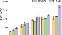 Table 4 illustrates the effect of partially substituting cement with PFS on the standard consistency and setting time. The amount of water needed to make cement paste that will allow the Vicat plunger to penetrate to a point 5–7 mm from the bottom of the Vicat mold is known as the standard consistency of cement paste. Standard consistency of OPC and PPC was 33% and 36% respectively whereas OPC cement with 10%, 15% and 20% PFS were having standard consistency of 35.5%, 37% and 38.5% respectively. It was observed that the standard consistency of the cement and PFS mix increased as the percentage of PFS was increased. Reason for the increasing trend of standard consistency can be understood from the need of additional water to moisten the fine PFS particles having higher surface area and adsorption pores. Some of the water had been absorbed by the PFS particles while making a consistent paste of cement-PFS mix33. Initial setting time as well as final setting time of OPC get affected due to partial blending of PFS. Initial setting time should not be shorter than 30 min, and the duration of final setting should not exceed 600 min34. It can be seen in the Table 4 that all the cement-PFS mix has higher setting times but lies within the prescribed limits and thus can be used for preparing mortar or concrete where delayed setting is not an issue.