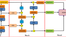 Let \({X}_{a}\in {\mathbb{R}}^{H\times W\times C}\) be the input feature map of the ASFM module, where \(H\) and \(W\) represent the height and width of the feature map, respectively, and \(C\) denotes the number of input channels. First, \({X}_{a}\) is fed into the CBS module, transforming the feature map size to \(H\times W\times C\_out\). Next, the feature map is evenly split into two parts, which are then fed into the main branch and the identity mapping branch separately. The main branch is further divided into an identity mapping branch and a MSBlock branch, where the feature maps in both branches have the same size of \(H\times W\times {C}_{out}/2\). The MSBlock branch consists of three sub-branches. The first sub-branch is an identity mapping branch. The remaining two sub-branches are composed of cascaded 1 × 1 convolution, 9 × 9 convolution, and another 1 × 1 convolution. At this stage, the feature maps in all three sub-branches of the MSBlock branch are of size \(H\times W\times {C}_{out}/6\). Then, the feature maps from the main branch and the identity mapping branch are concatenated, resulting in a feature map of size \(H\times W\times {3(C}_{out}/2)\). Finally, the concatenated feature map is passed through the CBS module to obtain the output feature map of the ASFM module, denoted as \({X}_{a}{\prime}\in {\mathbb{R}}^{H\times W\times C\_out}\). Notably, each CBS module consists of a cascaded 3 × 3 convolution module, a batch normalization layer, and a SiLU activation function.