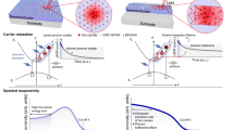 Figure 2a presents the PL spectra recorded at excitation densities ranging from 2.5 to 147 W/cm2. The PL intensity exhibits a sublinear dependence on excitation density, with a slope of approximately 0.88 as shown in the log–log plot (Fig. 2b). This sublinear behavior suggests an increasing contribution from nonradiative recombination channels, such as Auger processes, at higher carrier densities. However, complete saturation is not observed within the measured excitation range. Additionally, the band-edge emission near 2.147 eV exhibits a blue shift and spectral broadening with increasing carrier density, attributed to band filling, bandgap renormalization (BGR), and the effects of free carriers due to exciton binding energies23,24,25. Time-resolved PL measurements reveal that, at low excitation densities, the decay follows a relatively long timescale dominated by single-exciton radiative recombination (Fig. 2c). In contrast, at high excitation densities, PL decay accelerates owing to Auger recombination, anon-radiative process in which the recombination energy is transferred to a third carrier, resulting in a reduced PL lifetime. To ensure high signal quality, time-resolved PL measurements were performed at wavelengths corresponding to the peak emission. At low temperatures, the decay dynamics across the PL band are qualitatively similar, with minor variations attributed to spectral inhomogeneity and state filling. These observations support our interpretation of exciton and biexciton recombination dynamics under high-excitation conditions. The initial e–h pair density, n(0), can be estimated using the expression \(n\left( 0 \right) = j\sigma_{0}\), where j denotes the photon fluence per laser pulse (cm−2), and \(\sigma_{0}\) denotes the optical absorption cross section of the QD at the pump wavelength (cm2). The optical absorption cross section of the QDs can be expressed as the product of the bulk absorption coefficient and a local-field correction factor \(\left| {f\left( \omega \right)} \right|^{2}\) as26, \(\sigma_{0} = \alpha_{b} \left( \omega \right)\frac{{n_{1} }}{{n_{2} }}V\left| {f\left( \omega \right)} \right|^{2}\). Here \(, n_{1}\) and \(n_{2}\) denote the real parts of the refractive indices of the QD material and surrounding medium, respectively, and \(\alpha_{b} \left( \omega \right)\) represents the bulk absorption coefficient at angular frequency ω. The local-field correction factor is expressed as \(f\left( \omega \right) = 3m_{2}^{2} /\left( {m_{1}^{2} + 2m_{2}^{2} } \right)\), where m1 and m2 denote the dielectric constants of the surrounding medium and the bulk CdTe material, respectively. At 400 nm, the optical absorption cross section \(\sigma_{0}\) of QDs is calculated to be 3.4 × 10−13 cm2. Under this approximation, the density of states in the QDs is treated as bulk-like, which may result in an overestimation of exciton density at high excitation intensities. Assuming a Poisson distribution for early-time QD occupancy, the pump-power-dependent PL intensity is expressed as a function of photon fluence per laser pulse \(: I_{PL} \sim \left( {1 - e^{{ - j\sigma_{0} }} } \right).\) Fitting this model to the experimental data in Fig. 2b yields an absorption cross section of \(\sigma_{0}\) = 5.35 × 10−13 cm2. These values allow the conversion of measured PL intensity into the corresponding number of generated e–h pairs.
