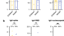 Adults and children who were SARS-CoV-2 seropositive (Methods) had significantly higher SI (p < 0.0001 adults, p = 0.01 children, Fig. 2a) and SII (p < 0.0001 adults and children, Fig. 2b) magnitudes compared to individuals who were seronegative. However, this increase in SI/SII magnitude was not correlated with an increase in viral nucleocapsid titers for either adults (Pearson 0.14, p = 0.18 for SI, Pearson 0.22, p = 0.03 for SII) or children (Pearson − 0.06, p = 0.77 for SI, Pearson 0.14, p = 0.49 for SII, Fig. 2c and d). This lack of significant correlation (p > 0.05) was also present for all other SARS-CoV-2 antigens (S, RBD, S1 and S2) for adults and children, except for Adult S2/SI (p < 0.001) and S2/SII (p = 0.001) (Extended Data Fig. 2 and Extended Data Table 3).