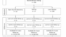 Thermal ablation of thyroid nodules has been shown to be effective and safe2,11,12,13. It is a convenient option that can be performed in the outpatient setting at a relatively low cost and without radiation. Although there is a risk of thyroid/parathyroid function damage after thermal ablation, it is not an absolute risk as with radioactive iodine. Still, previous studies reported a low willingness of American and European thyroid physicians to use thermal ablation for the management of thyroid nodules22,23. Of course, the availability of specialized equipment could influence surgeons’ decisions. In addition, the destruction of the tissues without removing them prevents the possibility of histopathological examinations to determine the exact nature of the nodule. Still, the main indication of thermal ablation is for solid nodules proved benign by two successive FNAs or for cystic nodules refractory to ethanol ablation14. Therefore, according to guidelines14, thermal ablation is used for thyroid nodules with a low risk of malignancy. Still, the accuracy of FNA for thyroid nodules is not 100%29, but in the absence of signs and symptoms of malignant disease, thermal ablation of thyroid nodules is a reasonable option.