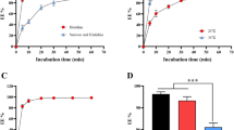 Samples were centrifuged at 14,000×g for 1 h at 10 °C to determine the encapsulation efficiency (EE%), drug loading (DL), and drug content (DC%) of Methotrexate-loaded solid lipid nanoparticles (MTX-SLNs) and Lactoferrin-conjugated Methotrexate-loaded solid lipid nanoparticles (MTX-Lf-SLNs)35. Samples were then quantified of the drug contents in supernatants with a UV-visible spectrophotometer with calibration curves. The EE% was obtained by finding the percentage of total drug that was entrapped within the nanoparticles. The DL was determined to be the mass of the total drug per mass of the nanoparticles. The drug content, DC%, was found to represent the percent drug within the mass of nanoparticles based on the following equation:
