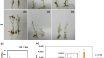 200 mg of plant tissue was homogenised in 2 ml 0.2 N HClO4, and the homogenates were centrifuged at 4 °C for 10 min at 10,000 g. The supernatants were used for dansyl chloride derivatisation reactions according to Németh et al.30. Briefly, 100 μl aliquots of the supernatant were added to 200 µl of saturated sodium carbonate and the reaction was started with 400 μl of dansyl chloride in acetone (5 mg ml−1). The mixture was incubated at 60 °C for 1 h in the dark, and stopped with 100 μl of proline (100 mg ml−1). After 30 min, the PAs were extracted with 500 μl of toluene with vigorous vortexing for 30 s. The organic, upper phase, containing the PAs, was completely dried under nitrogen. The PA residue was dissolved in 1 ml of methanol, ultrafiltered through nylon membranes and used for analysis. The analysis of dansylated PAs was carried out according to Pál et al.25 via HPLC using a W2690 separation module on a reverse phase column (Kinetex C18, 5 μ, 100 × 4.6 mm, Phenomenex, Inc.) and a W474 scanning fluorescence detector with excitation at 340 nm and emission at 515 nm (Waters, Milford, MA, USA).
