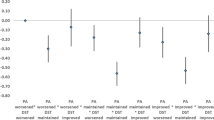 The daytime PA data were analyzed using multivariate regression models to assess both average hourly physical activity levels based on raw activity count data, and to examine PA intensity using METs conversion specific to the actigraphy devices we used36. Figures 3 and 4 summarize the PA results via coefficient plots (full results and sensitivity analysis are shown in the Appendix, Tables A21, A22, A23, A24, and A25, and Figure A1). SR predicted significantly lower average hourly PA compared to WR, and this result is robust to sensitivity analysis results shown also in Fig. 3 (see Appendix Table A21 for full results). Analysis of participant subgroups was also conducted. We had preregistered the hypotheses that the SR impact on PA would differ by BMI classification and TFEQ eating characteristics, but the data fail to support those hypotheses because the estimated SR effect was general—that is, SR lowered PA across all subgroups examined (see summary Figure A1 in Appendix A, supported by full results shown in Appendix Tables A22 and A23). When converting the data to generally accepted PA intensity categories46, the data in Fig. 4 (upper panel) show that SR significantly increased the proportion of wake-hour time classified as sedentary PA and lowered the proportion of time spent in all other intensity categories (light, moderate, and vigorous PA). Finally, we examined the impact of SR relative to WR on bouts of prolonged sitting and planned activity. Here, Fig. 4 (lower panel) highlights that SR predicted increased instances of prolonged sitting compared to the WR week, and the effect size is large (ηp2 = 0.133), but there was no significant difference in planned PA episodes during SR compared to WR (see Appendix A, Tables A24 and A25, for full estimation results supporting Figs. 3 and 4).