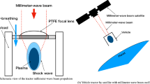 Figure 3a shows an integral image of the plasma structure obtained by placing a vortex phase plate in front of the center body. As shown for a pulse width of \(\tau =0.6\) ms, gas breakdown and strong light emission at the top of the center body were avoided when the vortex phase plate was mounted in front of the center body because the electric field intensity along the center body axis decreased. Besides avoiding the strong gas breakdown at the center-body top, the gas breakdown and plasma light emission at the rear side of the center body were successfully achieved, as shown in the image from the center-body rear at \(\tau =0.6\) ms. This plasma generation at the center-body rear could induce gas heating and shock waves via the Joule heating process. The high pressure of the shock wave interacts with the rear surface of the center body, pushing the thruster in the beam-source direction. Therefore, as shown in Fig. 3b, the net impulse (momentum coupling coefficient) becomes positive when the vortex phase plate is mounted, confirming that our MITA concept, which generates thrust using a tractor millimeter-wave beam irradiated from the front side of the vehicle, was experimentally achieved.