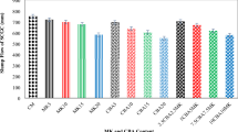 In addition, the maximum size of coarse aggregate should be considered, as benefits may lead to segregation between the aggregate and binder paste composite73. Flow testing began 3.5 min after the water contacted the binder. The testing environment was maintained at 23 °C and 53% humidity to minimize effects on measurements due to laboratory conditions. Adding reactive powder and Ag-PM-WCNT fibers can increase water capture within the composite mixture, reducing the formwork pressure. This is especially clear with reactive powder-GGBFS. The low water uptake capacity of the GGBFS does not significantly affect the flow of the composite material, as shown in Fig. 3. The reference composite has the highest flow, as expected. Consequently, the reference concrete is considered the most flowable material, as it does not comprise any reactive powder, Ag-PM-WCNT, or PCEP-BSP. The GGBFS with Ag-PM-WCNT reduces the lateral formwork pressure of the geopolymer composite, as observed in the GR-CBs. The composite type of GR-CB8, which contained 35 wt% geopolymer, 65 wt% GGBFS, 0.5 wt% Ag-PM-WCFNT, 2.5 wt% CQD, and 1.67 wt% PCEP-BSP, showed the greatest reduction in flow. The 65 wt% GGBFS, 0.5 wt% Ag-PM-WCNT, and 2.5 wt% CQD reduced the flow by 70% for the types of GR-CB8 (Fig. 1). This could be indicative of the flow level of the GR-CBs possibly being influenced by the water demands of the GGBFS, which might alter the water-to-cement ratio (w/c) in this blend, potentially reaching a level that might hinder optimal flow. The high demand of the reactive powder for water could explain the lower flow rate than that of the reference composite. GGBFS, Ag-PM-WCNT, CQD, and PCEP-BSP were blended into GR-CB, resulting in an average flow rate 30.8% lower than that of the reference composite. GGBFS and Ag-PM-WCNT and CQD reduce thixotropy, which is enhanced by PCEP-BSP. Similar results were reported in the literature. For example, Berra et al.74 noted a comparable outcome regarding the detrimental impact of incorporating nanoparticles on the workability of Ordinary Portland Cement (OPC) pastes. The slump measurements for all four mixtures, both with and without graphene, exceeded 200 mm, surpassing the recommended slump values for OPC concrete75. The elevated slump values observed in alkali-activated concrete can be attributed to the spherical nature of fly ash particles. Conversely, it was noted that the alkali-activated concrete mixtures, regardless of the presence of graphene, exhibited a certain stiffness due to the viscous sodium silicate solution. This stiffness rendered the alkali-activated concrete mixes somewhat challenging to place and compact. Similar findings concerning the fresh state characteristics of fly ash-based geopolymer concrete were documented by Olivia and Nikraz76. The expectation was that the inclusion of graphite-based carbon would lead to a reduction in the workability of alkali-activated concrete, primarily due to the water loss associated with the high surface area of graphite. In Hadi et al.’s investigation, the water content and the quantity of admixture in the mix design were elevated compared to the conventional mix designs of alkali-activated concrete referenced in earlier studies77,78. It was indicated that a ratio of additional water to aluminosilicate materials up to 0.38 yielded satisfactory compressive strengths for alkali-activated concrete79. Exceeding this threshold could potentially have a negative impact on the compressive strength of alkali-activated concrete80. In Chindaprasirt et al.’s study, the minor reduction in flow values resulting from the addition of graphene did not significantly influence the fresh state of the alkali-activated concrete. The mixture proportions for the alkali-activated concrete, both with and without graphene, were deemed appropriate for casting the necessary specimens for testing. There was no notable difference in the handling of alkali-activated concrete, irrespective of the presence of graphite-based carbon. However, GGBFS and Ag-PM-WCNT have been shown to reduce the thixotropy of the geopolymer binder, facilitating the use of pure geopolymer, reactive powder, and PCEP-BSP to provide a lower lateral hydraulic formwork pressure for GR-CB-based infrastructure renewal. GGBFS and Ag-PM-WCNT and CQD do not increase infrastructure renewal costs; they reduce the lateral hydraulic formwork pressure without chemical additives or vibration work loading. The PCEP-BSP is also classified as an admixture for reducing lateral hydraulic formwork pressure for infrastructure renewal.