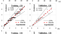 In Fig. 7, a selection of nonlinear regression equations has been employed to illustrate the correlation between the relative shear strength and the curing duration in water for GR-CBs, which encompass GGBFS, Ag-PM-WCNT, and PCEP-BSP. The degree of correlation, represented by R2, is also depicted in Fig. 7, indicating a commendable compatibility between the two specified properties. With an R2 value of 1, it becomes feasible to estimate the shear strength of GR-CBs on the basis of the curing period in water, utilizing the mathematical equations presented in Fig. 7, provided that at least one hardened GR-CB sample is prepared. However, in 2021, Sarvandani and other authors revealed the remarkable bridging effect of carbon nanotubes (CNTs) on the shear strength of glass-reinforced concrete (GR-CB). Their findings indicated a significant increase in the splitting tensile strength, achieving an impressive increase of up to 37%89. A parallel outcome was observed in the study by Al-Rub, where CNTs contributed to a remarkable 60% improvement in the splitting tensile strength90.