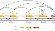 where \(\:{g}_{p}\) is the total number of constantly green traffic lights time steps given for phase p before initial time stage 0, \(\:{\:l}_{0}^{p}\left(i\right)\) and \(\:\:{v}_{0}^{p}\left(i\right)\)are instantaneous distance and speed of vehicle \(\:i\) from the stop line to its location in phase p at initial time stage. The travelling status of each vehicle when it leaves the approaching lane is defined by binary variables. This variable is judged after the initial departure time is determined for the convenience of updating the departure time of the vehicle in the following steps. The transition of two status modes is an irreversible process. Once a vehicle driving in free flow speeds changes to queuing status, this status will keep constantly up to be discharged. The statuses of the first vehicle and following vehicles in the lane counted from the stop line are expressed in Formulas (11) and (12) respectively.