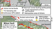 Rare marine shell fragments of millimeter size are collected from the stratigraphic succession for radiocarbon dating. The obtained conventional radiocarbon ages were calibrated to calendar year equivalents using the high-probability density range method27, utilizing the Marine20 database28 (Table 3). Two bivalve fragments collected in the deformed beds of the intermediate Sq2 sequence have provided very similar modeled radiocarbon ages of 2048—1714 and 2063—1724 cal BP, for a probability level of 95.4% (2σ). Two other bivalve fragments from the undeformed beds of the overlying Sq3 sequence yielded modeled ages of 1746—1430 and 1850—1530 cal BP. Considering a probability level of 68.2% (1σ), the paleo-earthquake Eq. 2 took place approximately 1800 years ago (Fig. 9). Three bivalve fragments from the deformed beds of the lower Sq1 sequence yielded modeled radiocarbon ages of 2142—1802, 2268—1932 and 2426—2082 cal BP., for a probability level of 95.4%, partially overlapping with the age range of Sq2 sequence. Considering the maximum ages obtained in the Sq2 samples for a probability level of 1σ, together with the minimum ages modeled in two Sq1 samples, the age of the paleo-earthquake Eq. 1 can be tentatively assumed at 2000 years BP (Fig. 9). The two suggested earthquakes occurred into an interval of about 200 years.
