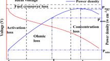 Figure 1 displays the polarization curve of a fuel cell operating at \(80^\circ\)C. The curve features three distinct regions: activation losses, ohmic losses, and concentration losses41. The nonlinear activation zone provides insights into the electrochemical processes within the cell. Ohmic losses typically occur in the membrane, while concentration losses result from changes in the concentration gradient within the cell59. The overall cell voltage, denoted as \(V_{\text {fc}}\), is expressed in equation (1)41: