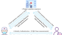 In order to calculate the communication overhead, this paper assumes a random number, hash value, symmetric encryption algorithm and ID length of 128 bits, elliptic curve dot multiplication algorithm output length of 256 bits, Chebyshev mapping algorithm length of 160bits, and timestamp length of 32 bits. \(U{E_j}\) sends \(\{ {M_1},{M_2},{M_3},{M_4},{T_{{r_j}}}(x),{T_{{k_j}}}(x),{D_1},{D_3},{t_3}\}\) to \(U{E_i}\) to request privacy information. This message needs 128 + 128 + 128 + 128 + 160 + 160 + 160 + 128 + 32 = 1152 bits. The \(U{E_i}\) returns the verification message \(\{ {D_4},{D_6},{t_4}\}\), which requires 160 + 128 + 32= 320 bits. \(U{E_j}\) requests the quantum key from \(U{E_i}\), and \(U{E_i}\) returns the quantum key ciphertext \(C{T_{ke{y_i}}}\) to \(U{E_j}\), which requires 128 bits. Therefore, the communication overhead required by this scheme is 1152 + 320 + 128 = 1600 bits. Reference46 in the stage of identity authentication and session key generation, the communication overhead is 8 elliptic curve dot product outputs, 6 hash function outputs, and 5 timestamps, so the communication overhead of reference46 is \(8 \times 256 + 6 \times 128 + 32 \times 5\) = 2976 bits, reference47 in the whole communication process, there are 13 hash function outputs and 2 ID outputs. Therefore, the communication overhead of reference47 is \(128 \times 15\) = 1920 bits. Our scheme only needs three interactions during authentication. In reference46, it takes one communication for the user to send the login request to the edge node (EN), one communication for the EN to send the login request to the medical center node (MC), one communication for the MC to process the login request and then return to the EN, and one communication for the EN to authenticate the MC to return the message to the user. Finally, it takes one communication for the EN to compute the session key and distribute it to the user and MC, for a total of five. In reference47, the processes of user registration, sensor registration, authentication and session key negotiation require 1 communication each, and a total of 4 communication times are required. Therefore, our scheme has obvious advantages in communication cost, which will become more obvious with the increase of the number of users.