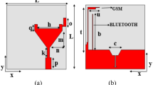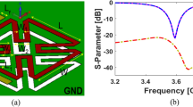 Figure 2 represents the design stages of the proposed antenna and its outcomes in terms of |S11|. It can be seen from the figure that a microstrip feedline antenna (step 1) is designed to have a square-shaped patch that operates at 6.02 GHz. The selection of material is based on the applications of the antenna, whereas the dimensions of the patch are obtained by using patch antenna equations provided in31. To improve the impedance bandwidth and matching of the proposed antenna, an L-shaped stub is loaded into the square-shaped stub. By loading the additional stub, additional reactive load is introduced which consequently reduces the return loss of the antenna. The antenna in step 2 offers the |S11|< − 10 dB impedance bandwidth of 5.95–6.20 GHz, having a resonance at 6.1 GHz. In step 3, another inverted L-shaped stub is loaded to the antenna, which further improves impedance matching together with a slight shift in resonant frequency. The proposed antenna is obtained after the third designing step having a broadband range 5.78–6.28 GHz that is 8.5% of the central frequency. The design evolution steps of the antenna along with its impact on the S-parameter is given in Fig. 2.
