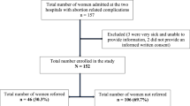 We collected data using patient questionnaires previously used across Africa and, more recently, Zimbabwe25. In all surveys, women/girls responded to three key questions: (1) “Before the pregnancy that brought you to the health facility today, how many induced abortions have you had?” (2) “Do you know anyone (woman or girl) who has done something to end their pregnancy?” (3) “For the pregnancy that brought you to the hospital to seek PAC, did you or someone else do something to interfere with its continuation?”. We coded the responses to question 1 as either “0” or “at least 1”. For questions 2 and 3, the responses were “yes” or “no”; we re-coded “yes” to question 2 as “know someone who has had an induced abortion” and “no” to represent “does not know anyone who has had an induced abortion”. Yes or no in question 3 were re-coded as “induced abortion” or “spontaneous abortion”, respectively. We also collected data on women’s socio-demographic characteristics (age, residence, marital status, religious affiliations, and education), and reproductive health characteristics (including previous child births, previous abortions, and knowledge of someone who has had an abortion).