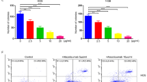 To investigate the antitumor effects of CDN on OS cells and the osteoblast cell, MG63, 143B, U2OS, HOS, SAOS2 and HFOB1.19 cells were treated with the indicated CDN levels for 24 and 48 h. Cell viability was subsequently determined via a CCK8 assay. The results showed that the proliferation of MG63 (Fig. 1B), 143B (Fig. 1C), U2OS (Fig. 1D), HOS (Fig. 1E), and SAOS2 (Fig. 1F) cells were dose-dependent (0–40 µM) and time-dependent after exposure to CDN for 24 and 48 h, while the cell viability of the osteoblast cell line HFOB1.19 was not significantly affected (Supplementary Fig. 1). The IC50 values of CDN for all five osteosarcoma cell lines were less than 20 µM after 24 h (Table 1), with U2OS and MG63 cells showing the greatest and least sensitivity, respectively. After extending the incubation time to 48 h, the IC50 values of CDN decreased for all the cell lines, with the largest decrease for HOS cells and the smallest decrease for MG63 cells, at 10.99 µM and 1.87 µM, respectively. Therefore, we conducted further studies on HOS and MG63 cells. Subsequently, a flow cytometry study was conducted with Annexin V FITC/PI to assess the impact of CDN on apoptosis. The findings showed that tumors with CDN group did not emerge a significantly elevated percentage of apoptotic cells in comparison to tumors with control group (Supplementary Fig. 2) It indicates that CDN has little effect on the apoptosis of OS cells.