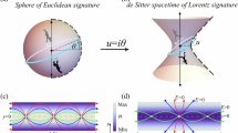 Some authors have formulated the spacetime perspective of the lens mapping as a mapping from a two-dimensional space of parameters that span the initial directions of light rays of the observer’s past light cone (the “sky of the observer”) into a two-dimensional space corresponding to (possibly a portion of) the source plane7,8,9. Following this approach, since our observer is on the optical (\(\hat{z}\)) axis about which there is axial symmetry, we can think of the final source positions at \(r_f\) as the pair \((\theta , \phi )\) with \(\theta\) given by Eq. 17 and \(\phi\) being a free parameter. Since \(\theta\) is determined by the parameter b and \(\phi\) is a free rotation about the \(\hat{z}\) axis, the lens mapping in this version of the spacetime perspective of lensing is a mapping from the space spanned by \((b, \phi )\) into the space of \((\theta , \phi )\). The Jacobian matrix would then be the matrix of partial derivatives of \(\theta\) and \(\phi\) with respect to b and \(\phi\).