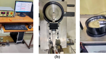 The ASTM G65 standard procedure was used for performing the dry sand abrasive wear tests. Quartz sand of particle size 212 µm was taken as abrasive sand, which was fed between the rotating rubber wheel and the test sample. The tests are conducted at a speed of 200 revolutions per minute and at a fixed sliding velocity of 2.38 m/s. The abrasive sand was fed at a controlled rate of 255 ± 5 g/min. Prior to testing, the specimens were cleaned with acetone, thoroughly dried, and their initial weight was recorded using a digital balance with 0.1 mg precision. The rubber wheel employed had a diameter of 228 mm. The tests were carried out for four levels of normal loads (10N, 20N, 30N, 40N), abrading distances (250 m, 500 m, 750 m, 1000 m) and filler weight% (0%, 0.75%, 1.75%, 2.75%). After the set test duration, removal of the specimen was done, cleaned thoroughly and weighed again (final weight). The weight difference before and after abrasive wear tests were found and are called the weight loss. Wear volume loss (ΔV) in (mm3 × 103) was calculated by the following Eq. 1,