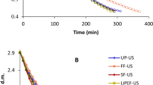 Figure 5 shows the impact of ultrasound, ethanol and ultrasound/ethanol pretreatments on the drying rate of rose petals versus time. All treatments showed a decreasing drying rate proportional to time. Initially, moisture was removed rapidly due to weak bonding and minimal internal resistance48. However, at the end of this stage and upon entering the descending stage, all the free water in the samples evaporated and, due to its resistance to moisture removal, the drying rate of the product decreased43.