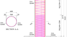 According to the Chinese Code for Design of Concrete Structures (GB 50010 − 2010)18, the size of the reinforced concrete column is 0.5 m × 0.5 m × 3.3 m, the concrete strength is C40, the reinforcement is HRB400, the longitudinal reinforcement is 6 φ 24, the stirrup is φ 10 @ 200, the thickness of the protective layer is 15 mm, the longitudinal reinforcement ratio is 1%, and the stirrup ratio is 0.3%. The finite element model and section reinforcement details of reinforced concrete columns are shown in Fig. 1. The finite element model adopts separate modeling. In the model, the concrete is modeled by SOLID164 unit, the steel bar is modeled by BEAM161 unit, and the bond relationship between the steel bar and the concrete is realized by the keyword * CONSTRAINED_BEAM_IN_SOLID. The constraint mode of reinforced concrete column is fixed at both ends, and the model adopts cm-g-us unit system. The explosion point is set directly above the middle of the column span, and the explosion load is applied by the S-ALE algorithm. When the reinforced concrete column is subjected to explosion load, the mesh will be deformed, resulting in inaccurate calculation. In order to solve the problem of grid distortion, on the basis of the previous trial calculation and reference to the research of Cao Yuhang et al.19, the erosion algorithm * MAT_ADD_EROSION is used to delete the failure unit of concrete in the model, and the threshold of deleting the failure unit is set to 0.1 maximum principal strain.