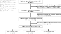 Participants with hepatic steatosis (FLI ≥ 30)22 were diagnosed with MASLD if they also presented with at least one of the following cardiometabolic risk factors: (1) BMI ≥ 23 kg/m2 or WC ≥ 90 cm in men and ≥ 80 cm in women; (2) fasting blood glucose levels ≥ 100 mg/dL or T2DM or specific drug treatment; (3) blood pressure (BP) ≥ 130/85 mmHg or specific drug treatment; (4) TG ≥ 150 mg/dL or specific drug treatment; and (5) HDL cholesterol < 40 mg/dL for men and < 50 mg/dL for women or specific drug treatment.