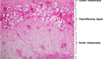 Scanning electron microscopy shows four major cell layers in date fruits: the exocarp, outer mesocarp, tanniferous layer, and inner mesocarp, including vascular bundles23. Light microscopy examination of the date fruits after staining with Mäule stain showed yellow to brown guaiacyl (G) and red to purple syringyl (S) lignin units and staining with Wiesner stain showed red to purple G-lignin units (Fig. 3). The G-units were deposited in the sclerenchyma and parenchyma cell walls and were especially concentrated in the sclereid (or stone) cells of the pericarp, while the S-units were deposited in the xylem vessels. It was reported that G-units exist in the primary cell walls of sclerenchyma and S-units are deposited in the secondary walls of the xylem vessels44,45. It was also revealed that G-units are deposited at the early stage of plant development, while S-units are deposited at the later stage, and there is the formation of a lignified sclerenchyma ring46. The presence of lignin in the epicarp and mesocarp of most fruits gives rigidity to the plant cell walls, especially the xylem vessels and the epicarp23,47,48. Most of the lignin in date fruits are linked with silica, forming association complexes that also contribute to the hardness of the fruits23. The majority is G-lignin in the sclerids or stone cells of the exocarp (stained red in Fig. 3), while the remaining is S-lignin associated with silica in phytoliths. Silica represented about 15% of the spheroid echinate phytoliths of the exocarp and the tracheary phytoliths in the xylem vessels confirming the coexistence silicification lignification in but their presence was negligible in the parenchyma cells and sclerids (results not shown).