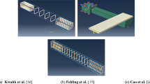 The stress–strain curve for UHPC concrete in compression consists of ascending and descending parts. Upon reviewing various existing models (Yan34, Zhao et al.35, Wang et al.36 and Graybeal37), it was concluded by Fakeh et al. 33 that the best simulating model for the stress–strain curve for UHPC is that presented by Graybeal 37 for the ascending part and by Prem et al.38 for the descending part. The UHPC elastic modulus \(E_{c}\) was calculated utilizing the formula proposed by Grybeal37. The stress–strain curve for UHPC in tension was derived based on the equations developed by In-Hwan et al.39.