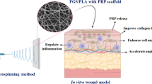 After 2 days of recovery, the mice were anesthetized again and a full-thickness skin wound was created in the central region of the chamber observation window by means of a 4 mm biopsy punch (GSK Consumer Healthcare, GMDT, Clocherane, Youghal Road, Dungarvan, Co. Waterford, Ireland) and microscissors (Fine Science Tools GmbH, Heidelberg, Germany) (Fig. 6a). The animals were then randomly assigned to two different groups, and their wounds were either filled with a mixture of 3 µL phosphate-buffered saline (PBS) and 5 µL PRP (PRP-treated group; n = 8) or with 3 µL freshly generated NF and 5 µL PRP (PRP + NF-treated group; n = 8) (Fig. 6a). The group size of n = 8 animals per group was chosen as in a previous study performed in the identical model21. In this previous study, this group size has been proven to provide statistically valid data, while reducing the number of required animals to a minimum according to the 3R principle. Inside the wound, the PRP was activated with 2 µL thrombin (10 U/mL dissolved in 10% CaCl2; Sigma-Aldrich, Taufkirchen, Germany) to ensure the formation of a stable gel. This enabled the fixation of the liquid NF inside the skin defect before the chamber observation window was closed with a cover glass and a removable snap ring.