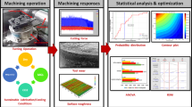 Liquid nitrogen (LN2) and cryo-CO2, two liquefied gases, are commonly used in cryo-machining, a state-of-the-art technique that replaces traditional cutting methods. The continued retention of the tool’s sharp cutting edges through the use of cryo fluids during cutting produces better surface quality27. This technique has become more well-known in the last few years because of its capacity to generate accurate and superior cuts28. The usage of cryo CO2 in the end milling of Ti64 was explored by Shokrani et al. to disclose the challenges linked with the cutting of these materials, including poor surface integrity and short tool life. According to the findings, end milling of Ti64 with cryocooling substantially improves surface integrity29. Cryo CO2 cooling has been shown to significantly lessen the cutting heat, cutting forces, and Ra in relation to dry and flood cooling conditions30. Jamil et al. investigated the effect of tool wear and Ra performance in the turning of Ti64 with cryo coolant. The trials exposed that CO2-snow cooling minimized Ra and tool wear31. Although cryo-CO2 cooling has demonstrated improvements in machining performance, but it is also significant to note that the cooling capabilities and effects on machining parameters can differ between cryo-CO2 and LN2 32. Due to the large number of parameters involved in machining, the Response Surface Methodology (RSM) is used to model and analyze the results, helping identify optimal conditions with fewer experiments. It saves time and cost while improving accuracy in process optimization. It includes the following general stages: screening, modelling, and optimisation33,34. A high degree of system knowledge can be achieved by the sequential experimentation strategy built into this methodology, provided that the non-technical and technical problems in the experimental phases are appropriately handled35. The less complex desirability-based techniques are simple to apply, understand, and adaptable to the preferences of the decisionmaker36.