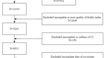 Frailty was quantified using a validated FI based on the cumulative deficit model, operationalized as the ratio of observed health deficits to the total number of potential deficits, yielding a continuous scale from 0 (optimal health) to 1 (complete frailty)20. The FI incorporated approximately 49 items spanning seven health domains to provide a comprehensive health profile: cognitive function (memory impairment), physical dependency (difficulties in activities of daily living), depressive symptoms (assessed by PHQ-9), comorbidities (including arthritis, diabetes, cardiovascular conditions, and renal failure), healthcare utilization patterns (hospitalizations, medication use), physical performance metrics (grip strength and body mass index), and laboratory parameters (HbA1c, hemoglobin, lymphocyte counts)21,22. Participants with ≥ 80% completeness in item responses were included to ensure data reliability. Consistent with established clinical thresholds, FI scores were categorized as robust (FI < 0.10), pre-frail (0.10 ≤ FI < 0.25), or frail (FI ≥ 0.25) to reflect progressive vulnerability to adverse outcomes23,24.