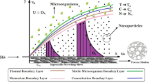 The above dimensionless ODEs, with the boundary conditions, are derived by employing different parameters such as \(\lambda = \, \frac{{g{\prime} \beta{\prime} \left( {1 - C_{\infty } } \right)\left( {T_{bf} - T_{\infty } } \right)}}{{ab^{2} x^{2} }}\) used as a mixed convection parameter, \(N_{r} = \, \frac{{\left( {\rho_{p} - \rho_{bf\infty } } \right)\left( {C_{\omega } - C_{\infty } } \right)C_{\infty } }}{{\rho_{bf} \beta \left( {1 - C_{\infty } } \right)\left( {T_{bf} - T_{\infty } } \right)}}\) as buoyancy ratio parameter, \(Ha = \, \frac{{\pi M_{ \circ } J_{ \circ } }}{{8\rho_{bf} b^{2} x}}\) as modified Hartmann number, \(d = \frac{\pi }{p}\sqrt {\frac{{\nu_{bf} }}{b}}\) as the thickness of the electrodes and magnets, \(N_{t} = \, \frac{{\tau D_{T} \left( {T_{bf} - T_{\infty } } \right)}}{{\nu_{bf} T_{\infty } }}\) as a thermophoresis parameter, \(Q = \, \frac{{Q_{ \circ } x}}{{u_{\infty } \left( {\rho C_{p} } \right)_{bf} }}\) as a heat generation/absorption parameter, \(N_{b} = \, \frac{{\tau D_{B} C_{\infty } }}{{\nu_{bf} }}\) as Brownian motion parameter, \({\text{Ec = }}\frac{{\left( {bx} \right)^{2} }}{{\left( {C_{p} } \right)_{bf} \left( {T_{bf} - T_{\infty } } \right)}}\) as the Eckert number, \(S = \, \frac{{ - v_{w} }}{{x\sqrt {b\nu_{bf} } }}\) as a suction parameter, \(Bi = \, \sqrt {\frac{{\nu_{bf} }}{b}} \frac{{h_{bf} }}{{k_{bf} }}\) as Biot number, \(\Gamma_{1} = \lambda_{T} a\) as a heat relaxation time parameter, \(\Pr = \, \frac{{\nu_{bf} }}{{\alpha_{bf} }}\) as Prandtl number, \({\text{Sc = }}\frac{{\nu_{bf} }}{{D_{B} }}\) as Schmit number, \(\Gamma_{2} = \lambda_{c} a\) as a mass relaxation time parameter, \(Lb = \frac{v}{{D_{m} }}\) as the bio-convection Lewis number, \(Pe = \frac{{bw_{c} }}{{D_{B} }}\) as Peclet number, \(\varpi { = }\frac{{N_{\infty } }}{{N_{\omega } - N_{\infty } }}\) as a non-dimensional bioconvection parameter.