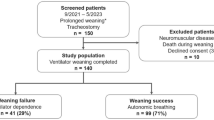 Statistical analysis was performed using SPSS version 28 (SPSS Inc., Chicago, Ill., USA). Categorical variables and group comparisons were analysed using the chi-square test. Numerical variables were analysed using Student’s t-test, or ANOVA (Analysis Of Variance), Mann–Whitney U-test or Kruskal–Wallis-Test as appropriate. Results were considered statistically significant at p values < 0.05. All significant variables were analysed using binary logistic regression analysis to assess independent risk factors for different weaning outcomes.